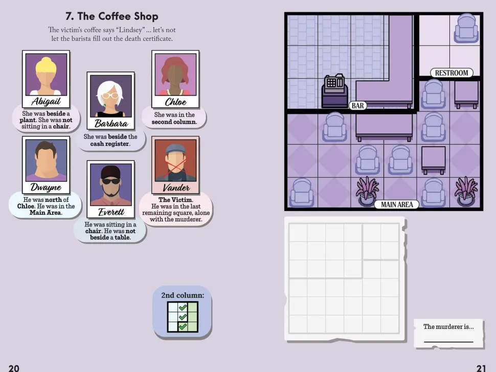 These visually appealing, addictive puzzles drop solvers into immersive mini murder mysteries, combining the elegant simplicity of games like sudoku with the storytelling of classic logic problems.But Murdoku introduces its own unique element: full-color visual representations of the characters’ environments, with each element playing into the investigation: rooms, furniture, plants, animals, and sometimes additional rules that add an extra twist. You’ll explore 80 crime scenes including a bakery, a casino, a chess tournament, a farm, an opera, … the variety is endless. The puzzles start out easy and gradually increase in difficulty to expert level.Do you have what it takes to become a master detective?