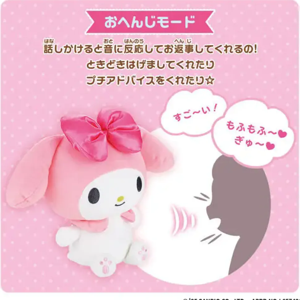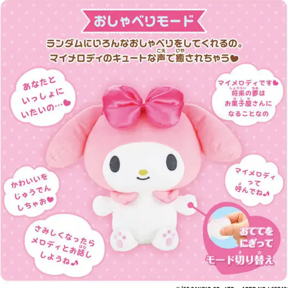 This My Melody plush talks a lot, featuring over 75 recorded phrases and 3 different modes.