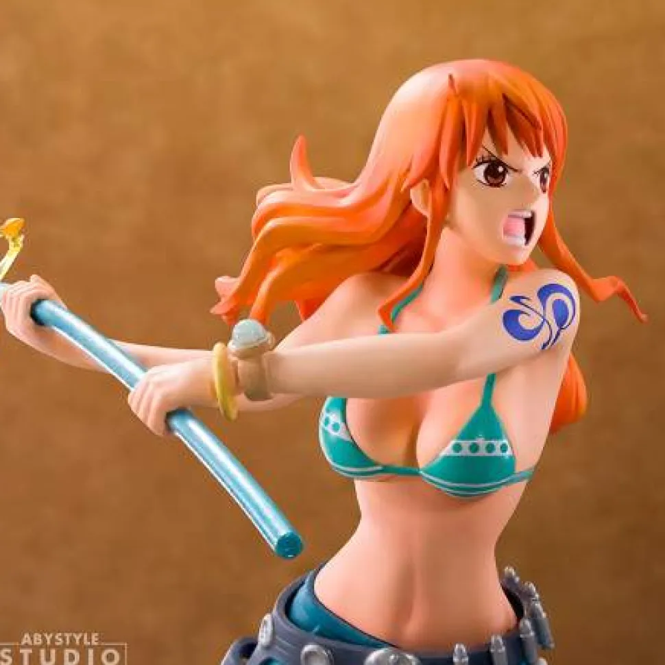 This Nami figurine by ABYstyle Studio in combat mode captures the moment she prepares to use her Climat-Tact to defend the Straw Hat crew. Her floating hair and dynamic posture are even more emphasized by the base, which features flashes of light and wind, illustrating the power of her weapon. A must-have for One Piece fans, showcasing Nami’s strength and confidence in the midst of battle.
