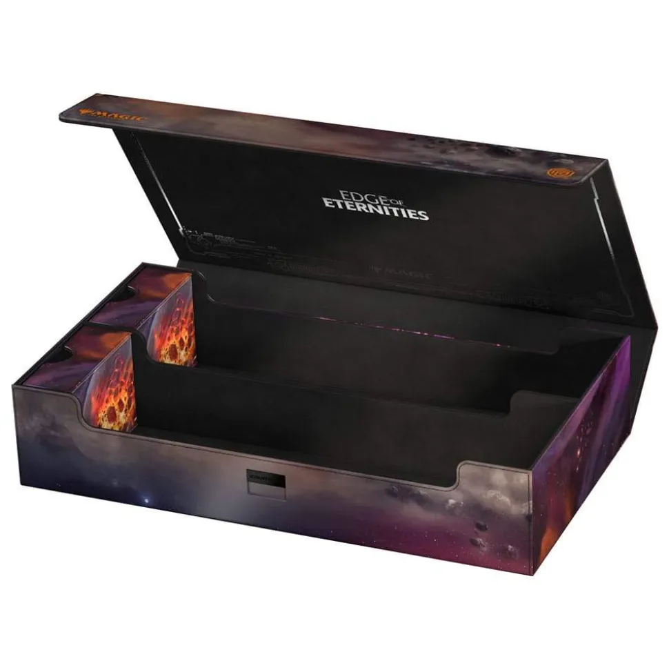 The Omnihive 1000+ Xenoskin, featuring officially licensed MTG art from «Edge of Eternities», is a mass storage box designed to hold multiple deck boxes, dice and/or Play-Mats at once—or alternatively a large collection of single cards (up to 1000 double-sleeved). The two practical and flexibly positionable magnetic trays inside are, like the outside of the box, made of full-color printed and resistant Xenoskin material and have a quality microfiber inner lining. The lid of the Omnihive 1000+ Xenoskin is secured with strong magnets and an additional ZnapClaw mechanism.