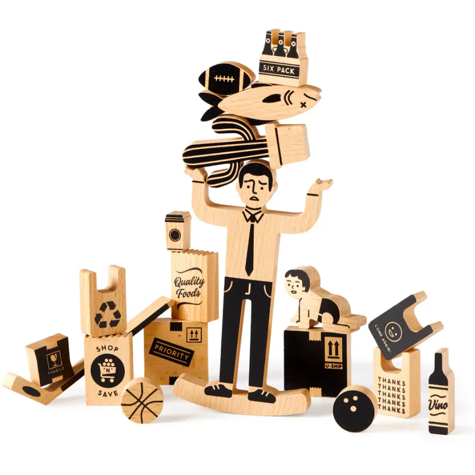 HOW TO PLAY – Players complete by taking turns adding increasingly ridiculous grocery themed items on top of a man shaped starting block–as they try not to be the one that knocks it all down. Includes 19 wood game pieces with double-sided printing and instruction sheet.