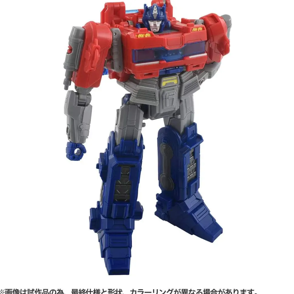Optimus Prime from the new full CG-animated film «Transformers: One» is now a fun figure from Takara Tomy, equipped with three-stage transformation plus light and sound gimmicks! He transforms from his vehicle form to Orion Pax, and then uses swing action to transform to Ultimate Power Mode and his full 26cm height! Each mode features a different sound gimmick, and there’s a light gimmick too. In robot mode, the chest part opens and closes, and the matrix, which is proof of leadership, can be stored and removed. A special energy axe and blade are included too. Order him for your own collection today!