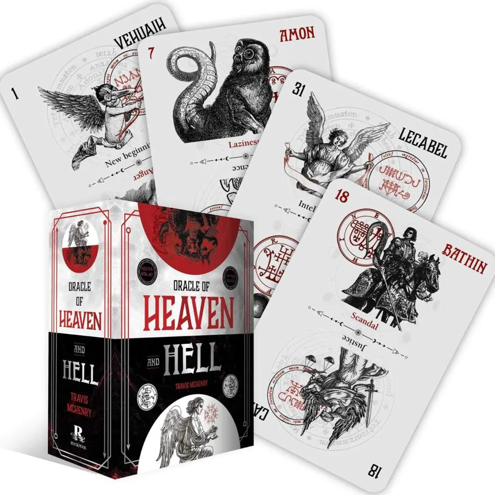 This unique oracle of 72 cards combines both infernal and divine powers, with each card containing the image of one goetic demon and the Kabbalistic angel that rules over that demon. In addition to the drawings of the spirits, their summoning sigils are shown behind them. For ease of reading the astrological meaning of each spirit is printed on the card.