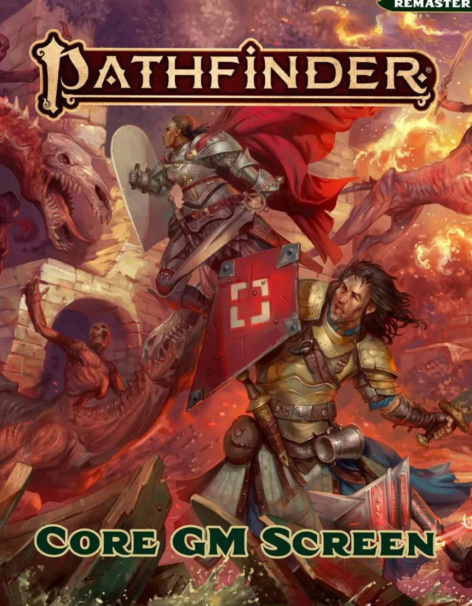 A good Game Master keeps many secrets, only to reveal them to the players when the time is right. Keep your secrets safe behind thePathfinder Core GM Screen. This sturdy four-panel horizontal screen features a stunning battle scene on one side and handy charts and game tables on the other side to give a busy GM everything they need to run Pathfinder. This screen has been updated with rules from thePathfinder Remasterand includes a useful chart of new terms, making it simple to run any adventure from Pathfinder Second Edition!