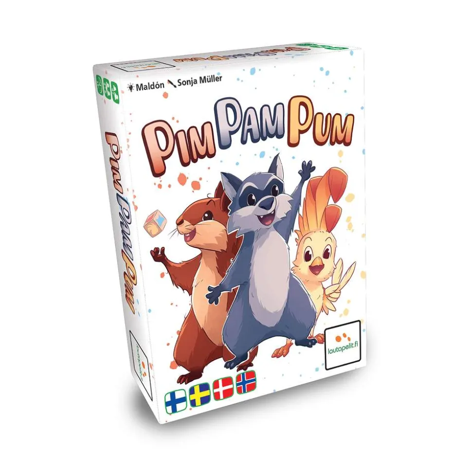 To play Pim Pam Pum, lay out cards face down in a 3×4 grid. Each card features 1-3 monsters in some combination of colors: red, yellow, and blue.On a turn, roll the die, then flip up a card that reveals an animal of the same color. If you do, you can collect that card and end your turn, or you can flip up another card. As long as the cards keep showing a match you can continue, stopping whenever you want to collect all revealed cards. If you ever fail to turn up a matching animal, flip all revealed cards face down and end your turn.Fill the card grid as needed, and keep playing until all the cards have been claimed. Whoever collects the most cards wins.