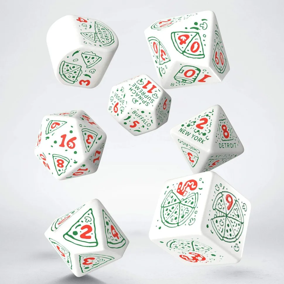 Spicy treat, coming along!The most popular snack at RPG sessions gets a tribute! The Pizza Dice Set: Pepperoni, inspired by this classic dish in a spicy form, brings a tasty atmosphere to the world of role-playing games. White dice with green symbols and red digits, in a box resembling an Italian pizza, allow you to roll for pizza style, toppings, and extra treats. Grab and roll it out!
