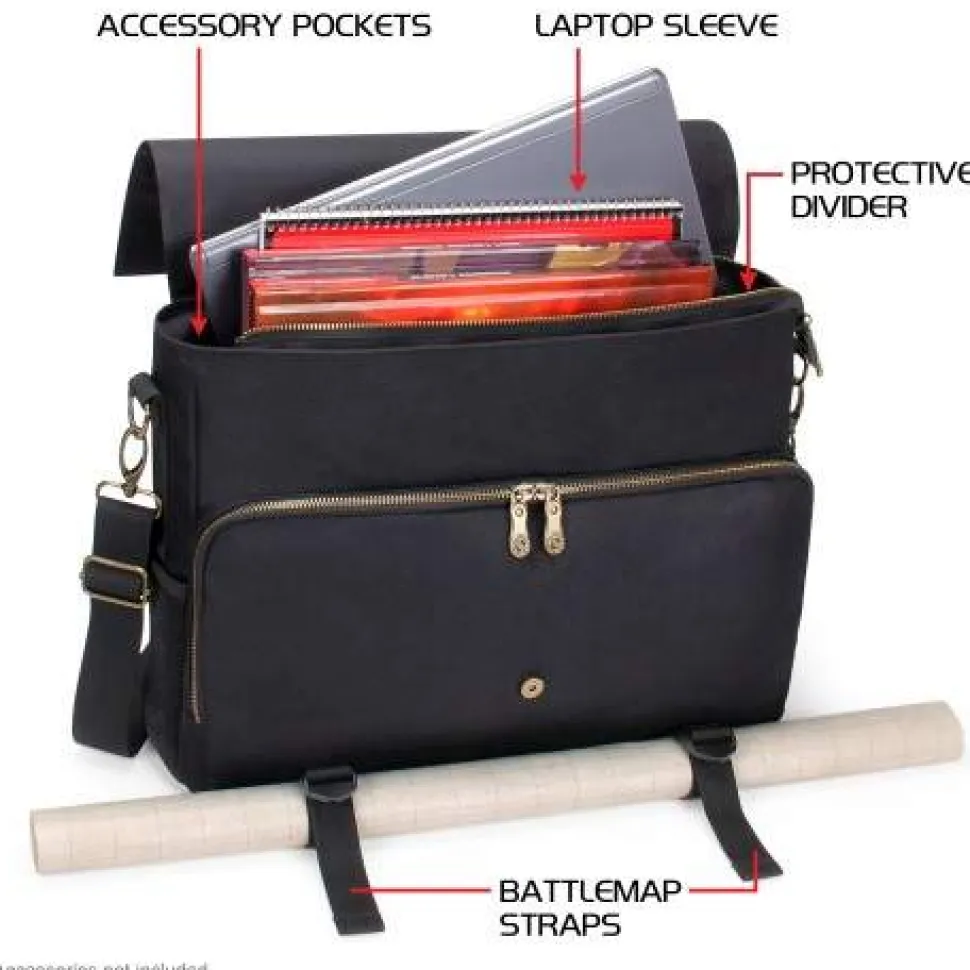 Equipped with Battlemap Travel Straps, Padded Laptop Sleeve, Heavy Duty Metal Clips, and Zippers. The messenger bag style design offers incredible versatility and comfort. The interior features a thick padded divider to help organize your character’s gear and includes enough space for up to 4 rulebooks, or a combination of binders, journals, folios, and more. There is a special compartment with an elastic security strap designed to hold up to 17″ laptops and tablets in place during travel. A very spacious front zippered pocket with another netted mesh zippered pocket inside is great for storing and organizing game materials such as dice, journals, tokens, pens, pencils, and much more.The RPG Essential’s Bag features two front facing battlemap storage straps perfect for traveling with a rolled up battle grid or map. The adjustable straps can be sized to hold maps up to 3 inches in diameter. Show up to your next session with your gear in order, and take on that next quest with the ENHANCE RPG Player Essential’s Travel Bag.