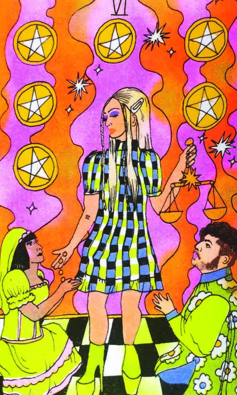 VIBRANT FULL-COLOR ART FROM ASH + CHESS: Queer Tarot features Ash + Chess’s signature colorful, risograph-style illustrations, including retro color palettes and bold, detailed figures.
