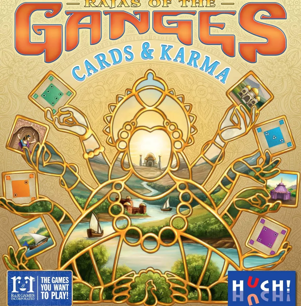 In Rajas of the Ganges: Cards & Karma, you compete for coveted double-sided cards that show buildings, goods, ships, or palace actions on one side and a colored die value on the other. Always keep an eye on your opponents’ actions and plans because what they would like to build could instead be useful to you as a dice card. Although perhaps you want to acquire another building yourself and increase your fame…provided you have the appropriate dice cards in your hand as a resource — or would you rather sell goods to get money?Pay attention to the 3 because if you have three cards of one type, you must swap them for workers — and while workers are multifunctional and useful, you don’t always want to get rid of your cards just yet.The first player to turn over all six target cards one by one through fame or money wins.
