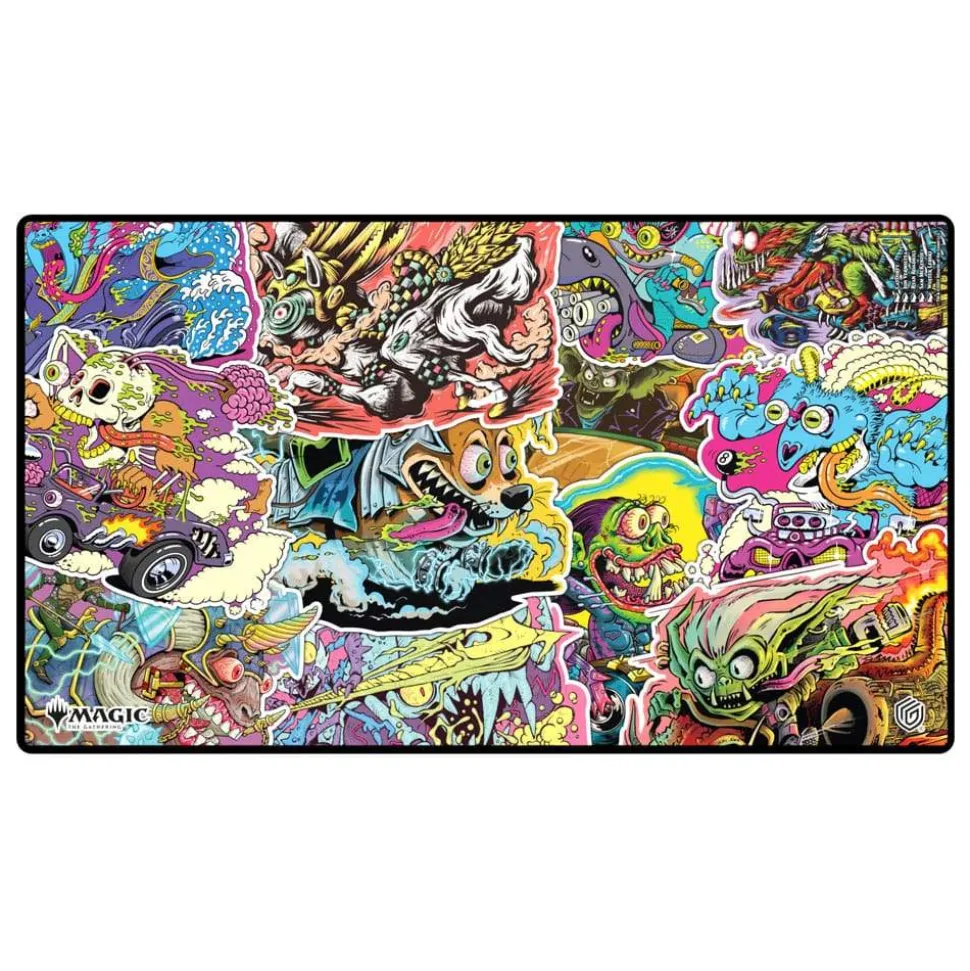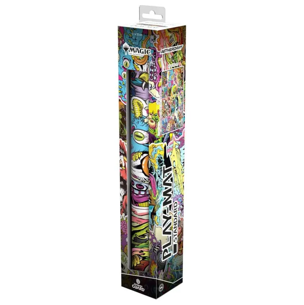 The Play-Mat in the standard size 61x35cm shows officially licensed artworks from Magic: The Gathering’s set Aetherdrift. The soft cushioned Play-Mat with non-slip underside improves the gaming experience, protects gaming cards and accessories, and is even more durable than classic Play-Mats thanks to its stitched edges.