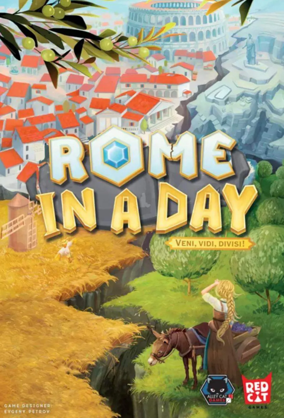The once thriving Roman Empire fell apart. Who can resist the temptation to claim some of the lands for themselves? Do you prefer vineyards or quarries? Or maybe you want a little bit of everything with some olive groves and an oil mill on top? All you need is to make a good trade: offer a beautiful antique theater in exchange or add a few precious diamonds… Divide and swap lands, outguess and bribe your opponents! Create a prosperous domain from the lots of Rome!Rome in a day is a simple strategy game based on the original «cut-and-choose» mechanic that will win the hearts of aspiring conquerors of all ages.Before the start, all players are dealt with their personal set of buildings with the card of buildings, a pile of lands tiles (there are 5 types – fields, city, olive gardens etc), gems/cristals, choice cards of smaller and bigger lands, reminder cards and screens.The game is played in 4 turns.During each turn, players take top 5 tiles of lands and place them in front of themselves. Then they take 2 top buildings from the building card and place them on the 2 lands from the left.Next, players take their screens and start divivding those 5 pieces of lands into 2 groups – a bigger and a smaller ones. In any ratio they want (32, 14 even 50). And add 1 crystal to the smaller land.When everyone is ready, the exchange begins.Players put the screens down allowing other players to see and choose a land that they have made.Note: at the first turn players choose the lands from a neighbour from the left, at 2nd – from the right, and then again left and finally right. For the max interactionWhen selection is made, players put a choice card reflecting their decidion of lands.Then, players take the chosen lands from the neighbour from the left and join them to the remaining piece of their own.Turn by turn, they build their domains, taking the most suitable lands to make their so-called new empire more profitable.How to gain points?For every kind of terrain with the corresponding building placed on it or next to it. Then the number of lands multiply with the number of buildings for EACH type of lands.The crystals gained for choosing smaller lands also bring points – 3 points for each crystal.The player with the most points wins the game.