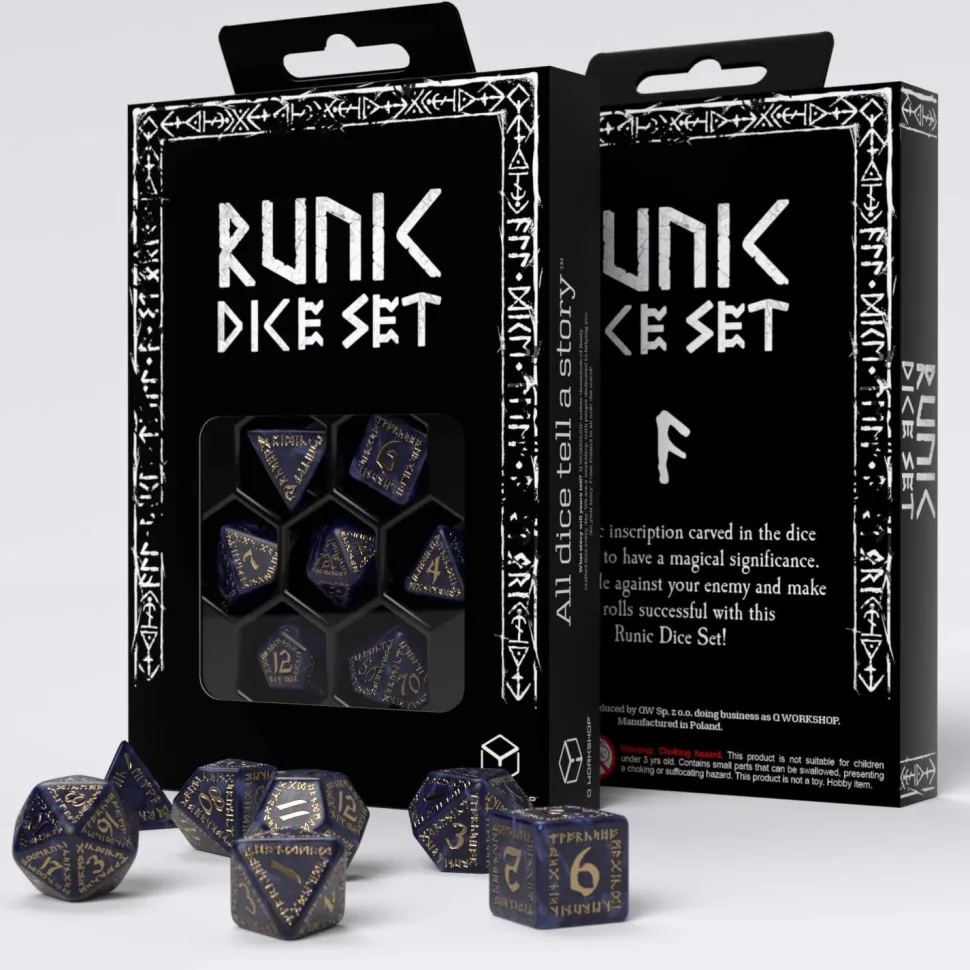 Dice enchanted with Runic alphabet. People have been studying Runic writing for ages, using it for mundane and mystic purposes alike. Golden engravings injade-like base create a powerful fusion of both magic and craftsmanship, making these dice your shield and sword against evil. Allow them to write your destiny with forces beyondour comprehension!