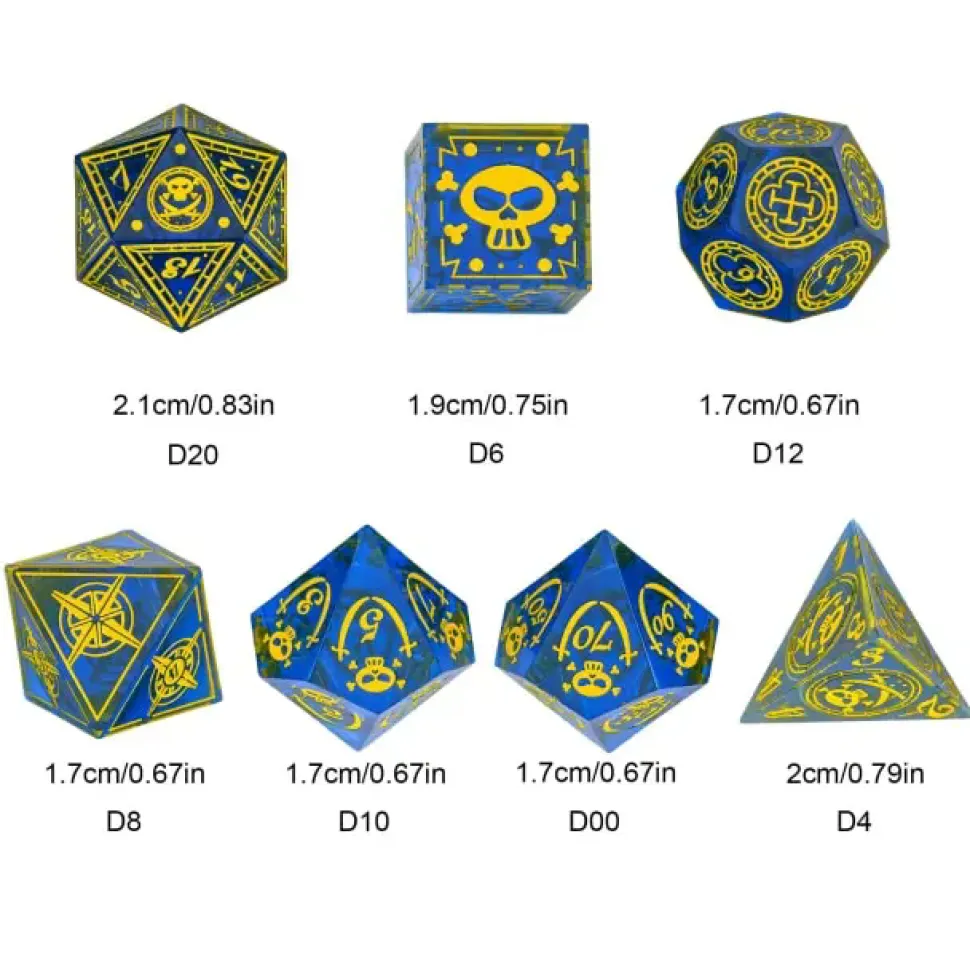 Et sett med syv forskjellige terninger, som passer til rollespill. Inkluderer: D4, D6, D8, D10, D12, D20 og en prosentterning.