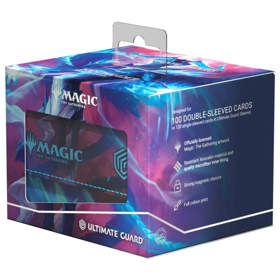 The Sidewinder 100+ made from durable Xenoskin material holds up to 100 double-sleeved or 120 single-sleeved cards, which are kept secure in the deck box thanks to a strong magnetic closure and soft microfiber interior. The sturdy, high-quality Xenoskin surface of the Sidewinder is printed in full color with officially licensed artwork from Magic: The Gathering’s Tarkir: Dragonstorm set.