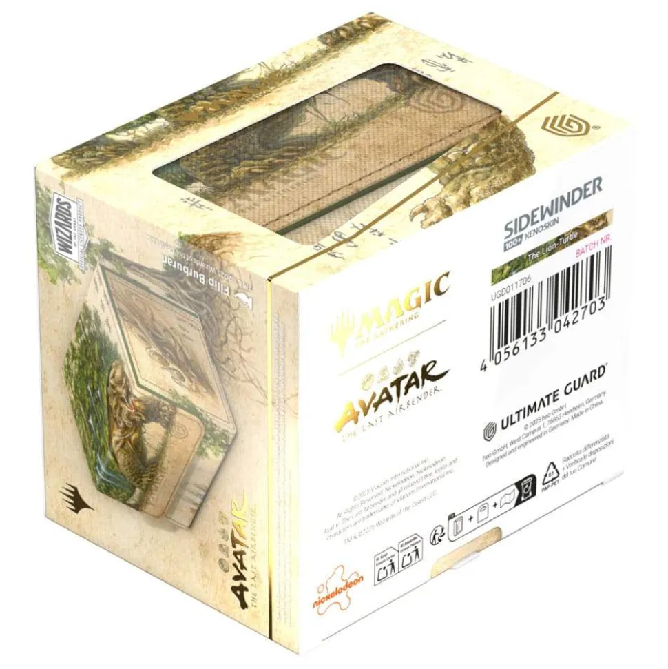 The Sidewinder 100+ made from durable Xenoskin material holds up to 100 double-sleeved cards, which are kept secure in the deck box thanks to a strong magnetic closure and soft microfiber inner lining. The durable, high-quality Xenoskin surface of the Sidewinder is printed in full color with officially licensed artwork from the Magic: The Gathering | Avatar: The Last Airbender set.