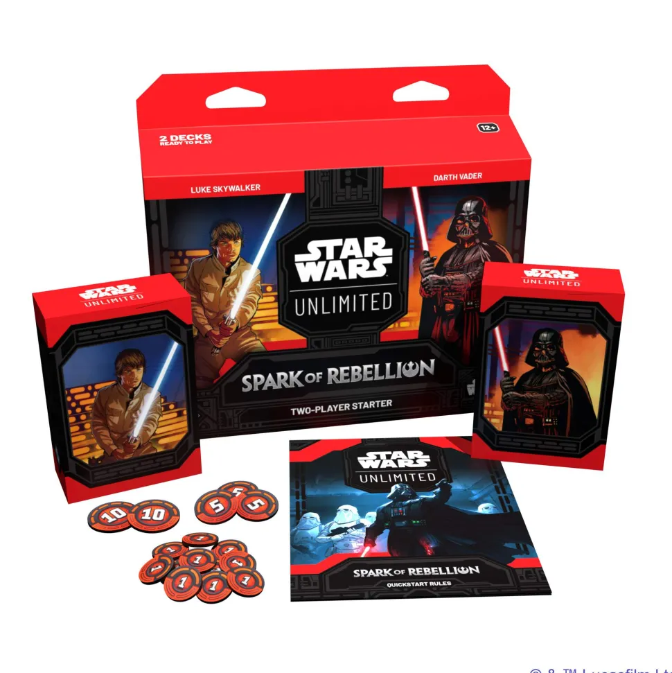 Enter a galaxy of endless possibilities in Star Wars: Unlimited! In this fast-paced, easy-to-learn trading card game, you and your opponent face off in exciting head-to-head battles full of iconic Star Wars characters. In the Two-Player Starter for the game’s first set, Spark of Rebellion, you’ll find two fully built, ready-to-play decks for you and a friend to dive in and start learning the game. Shield your allies as Luke Skywalker, or go on the offensive as Darth Vader!