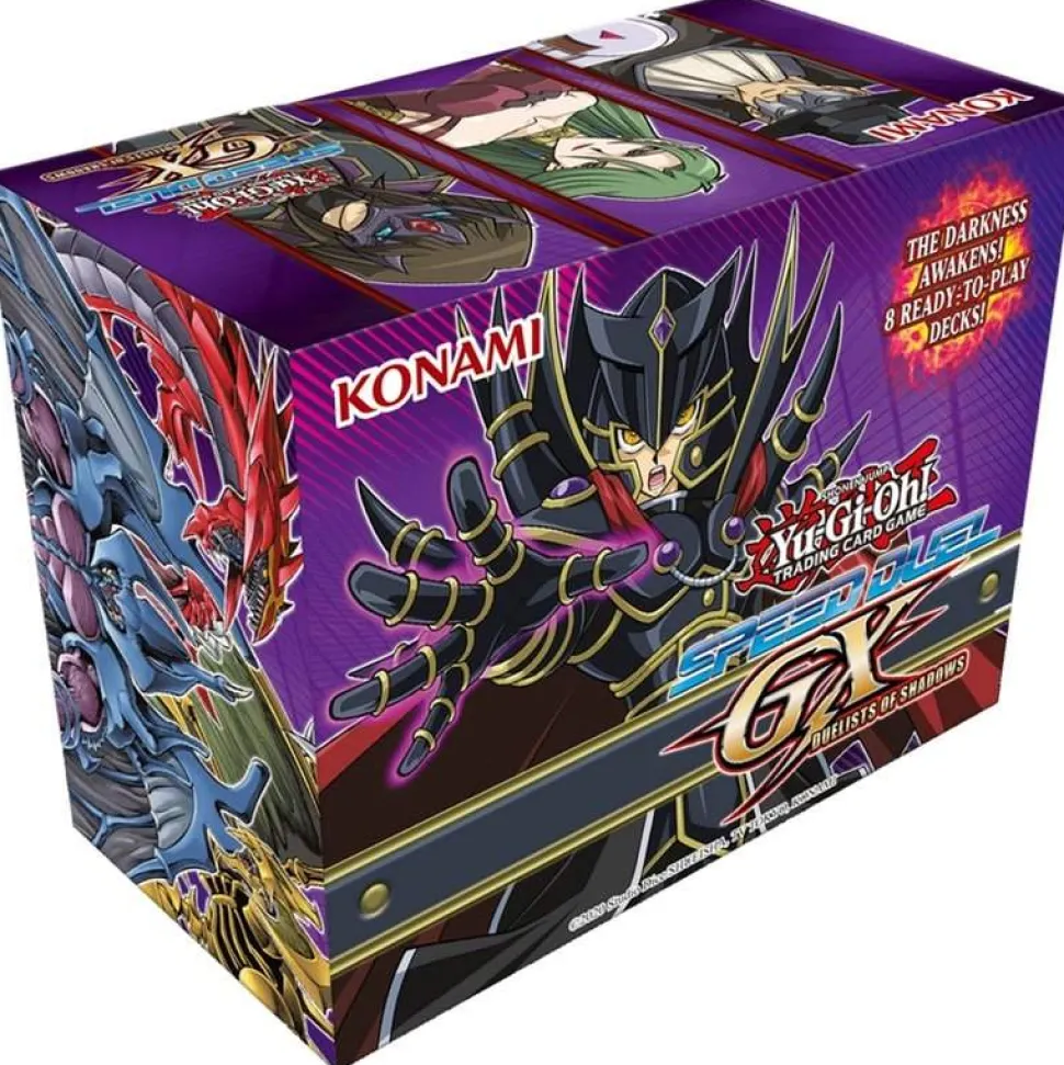 Shadows loom large over Duel Academy in the new 2023 Speed Duel GX Box*! The Shadow Riders have descended upon Speed Duel and joined forces with other villainous characters from the Yu-Gi-Oh! GX anime series to cause mayhem and unleash the mighty Sacred Beasts. This box set is designed to allow up to 8 players to jump into their own dynamic gameplay experience with 8 pre-constructed Decks along with a selection of other cards that can be used to customize them.