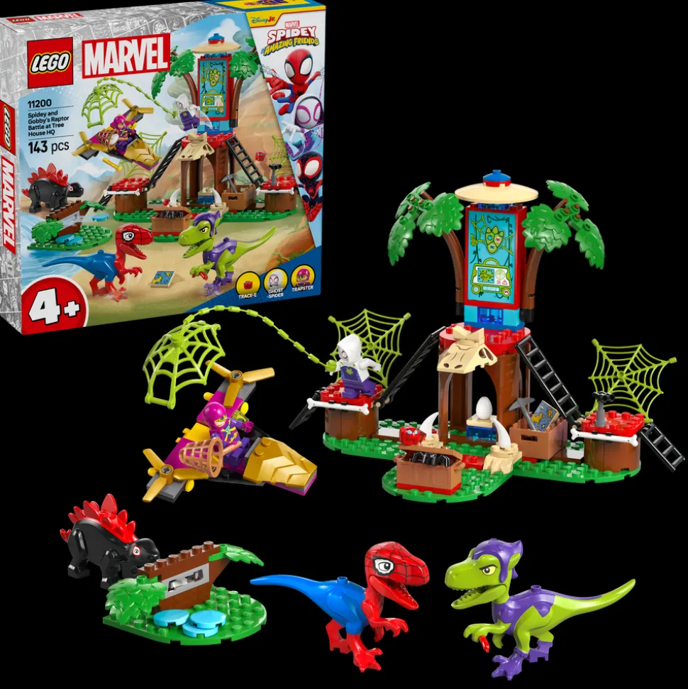 Fans av superhelter, dinosaurer og byggeleker fra fire år får alt de kan drømme om og mer til med bygge- og lekesettet LEGO® Marvel Spidey og hans fantastiske venner Spidey og Gobbys raptorkamp ved hovedkvarteret i treet (11200) for jenter og gutter.