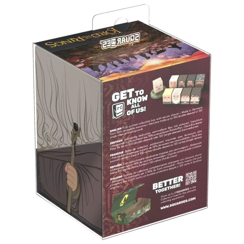 Collectible box for storing TCG decks, tabletop gaming accessories, and/or collectibles. The Gandalf the Grey Squaroe from the The Lord of the Rings edition holds up to 100 cards in double protective sleeves if used as a deck box. Squaroes are made from 78% renewable resources and fit perfectly into the separately available Collectors Case.