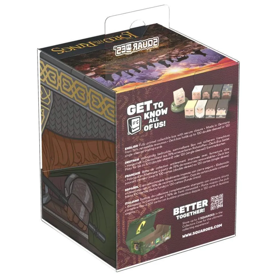 Collectible box for storing TCG decks, tabletop gaming accessories, and/or collectibles. The Gimli Squaroe from the The Lord of the Rings edition holds up to 100 cards in double protective sleeves if used as a deck box. Squaroes are made from 78% renewable resources and fit perfectly into the separately available Collectors Case.