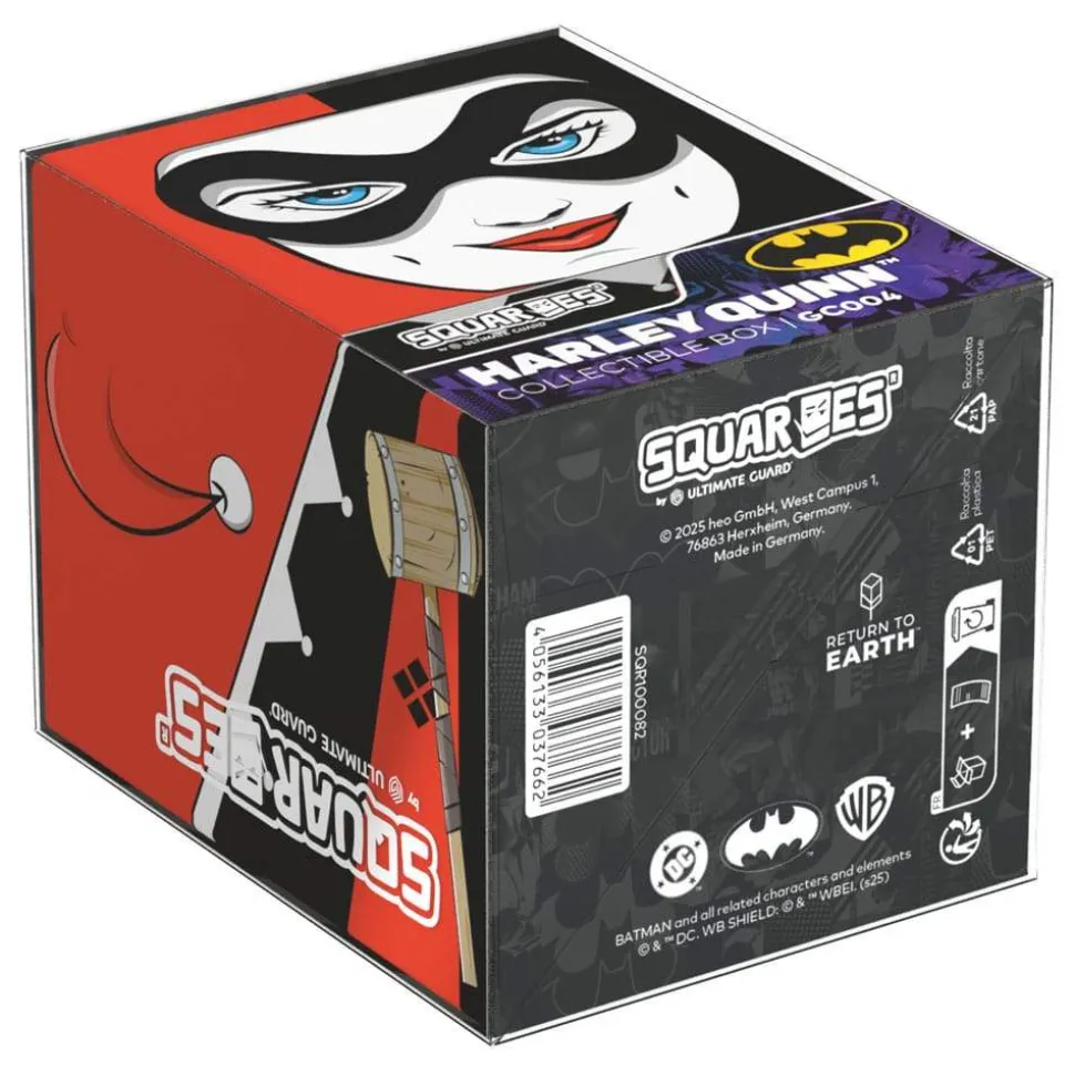 Collectible box for storing TCG decks, tabletop gaming accessories, and/or collectibles. The Harley Quinn Squaroe from the Batman: Gotham City edition holds up to 100 cards in double protective sleeves if used as a deck box. Squaroes are made from 78% renewable resources and fit perfectly into the separately available Collectors Case.