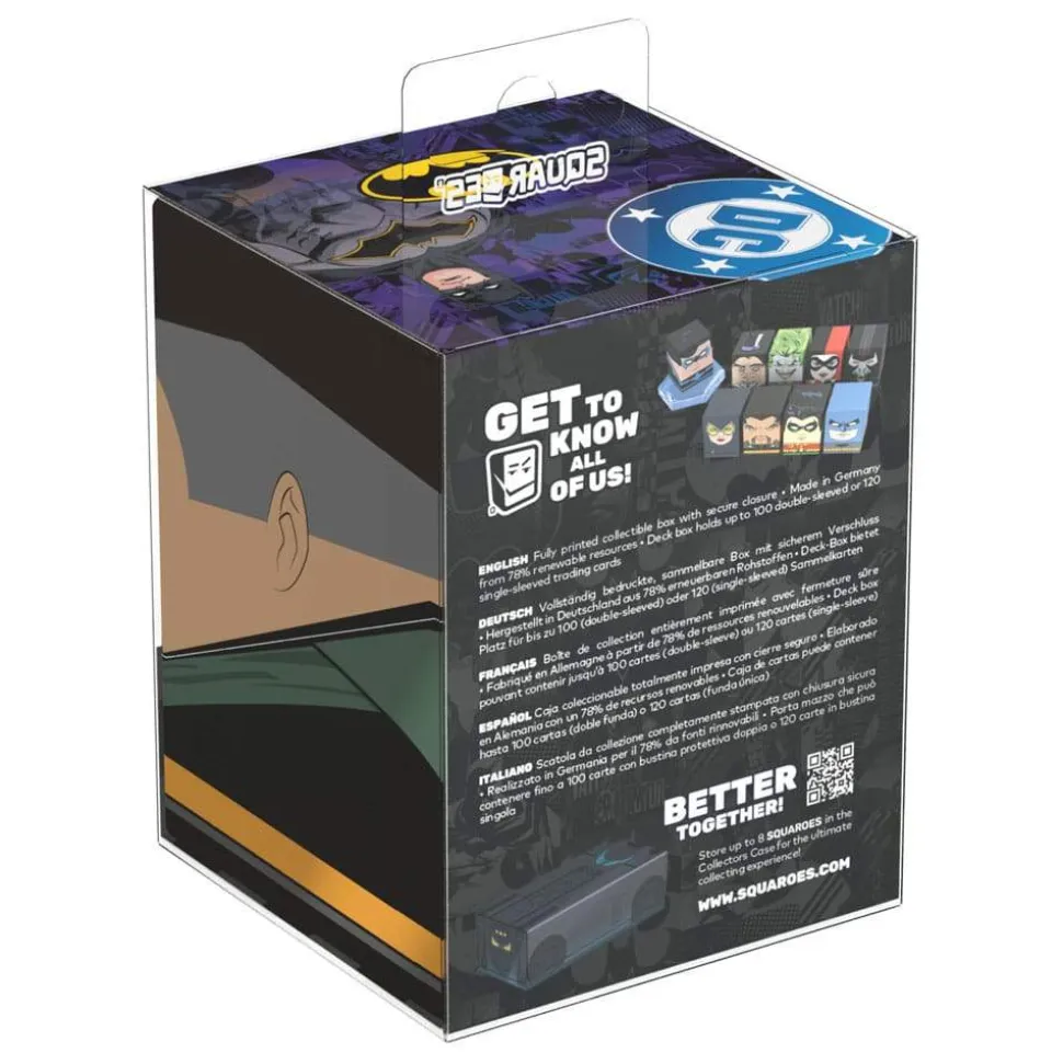 Collectible box for storing TCG decks, tabletop gaming accessories, and/or collectibles. The Ra’s al Ghul Squaroe from the Batman: Gotham City edition holds up to 100 cards in double protective sleeves if used as a deck box. Squaroes are made from 78% renewable resources and fit perfectly into the separately available Collectors Case.