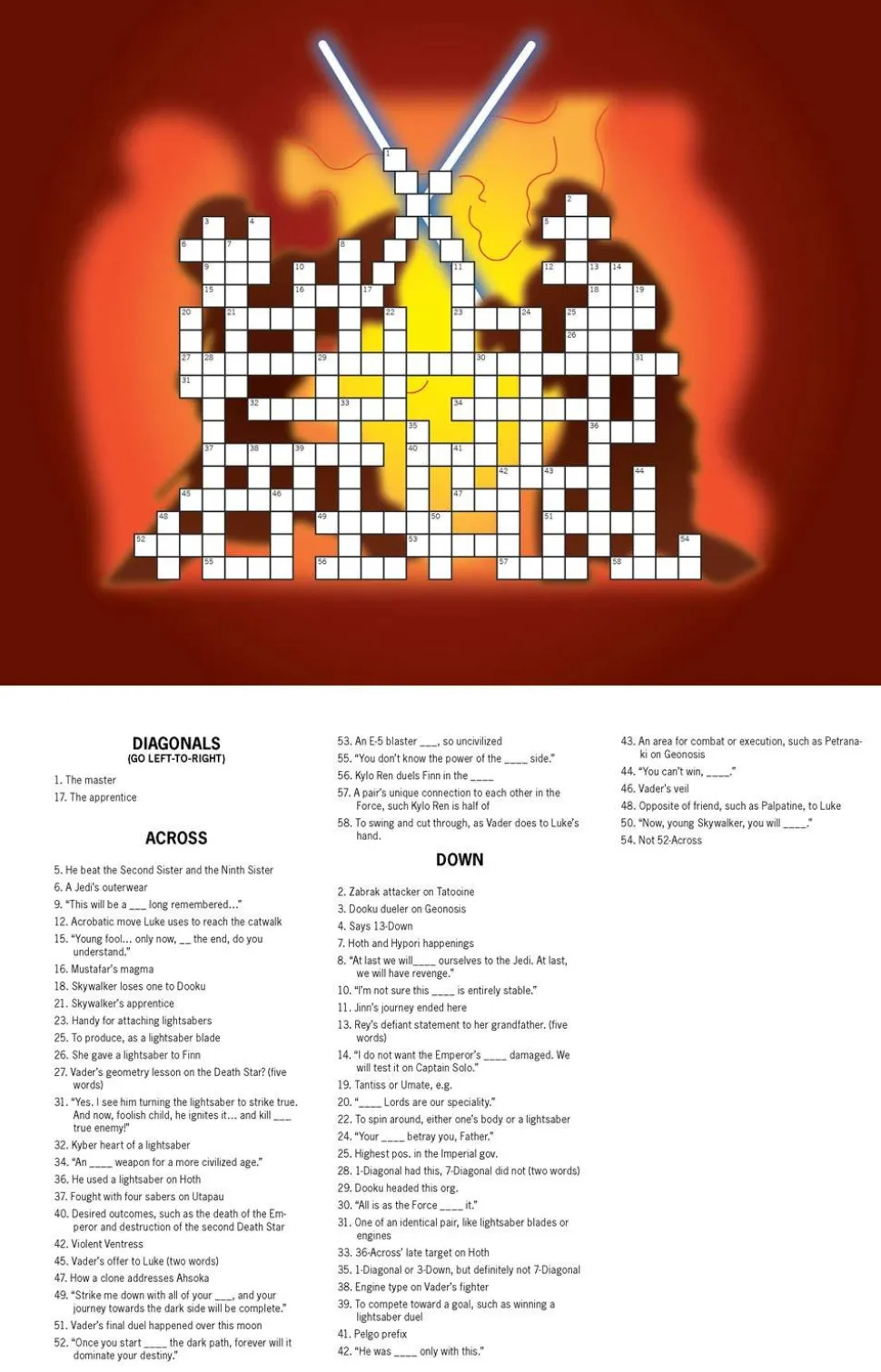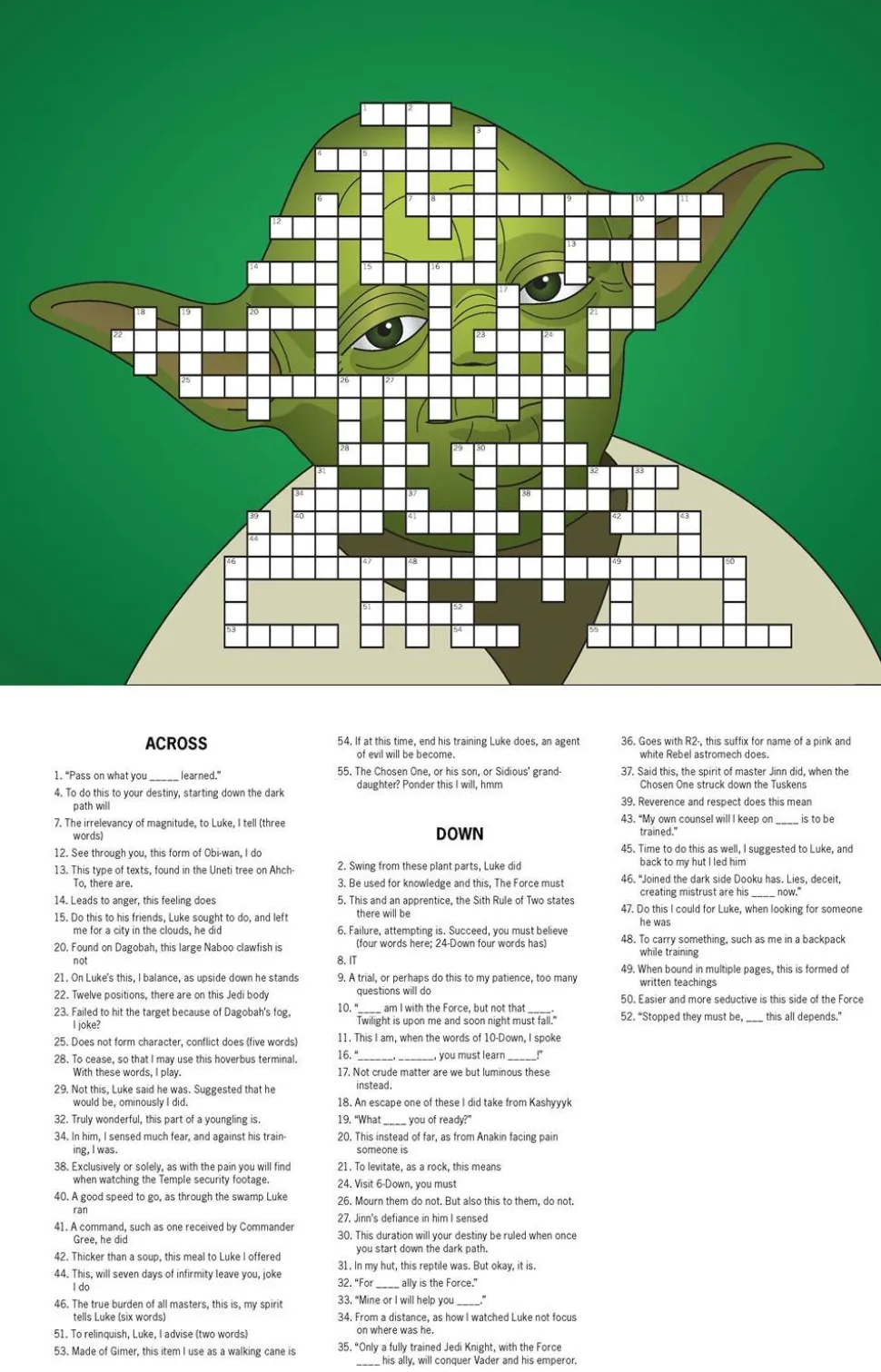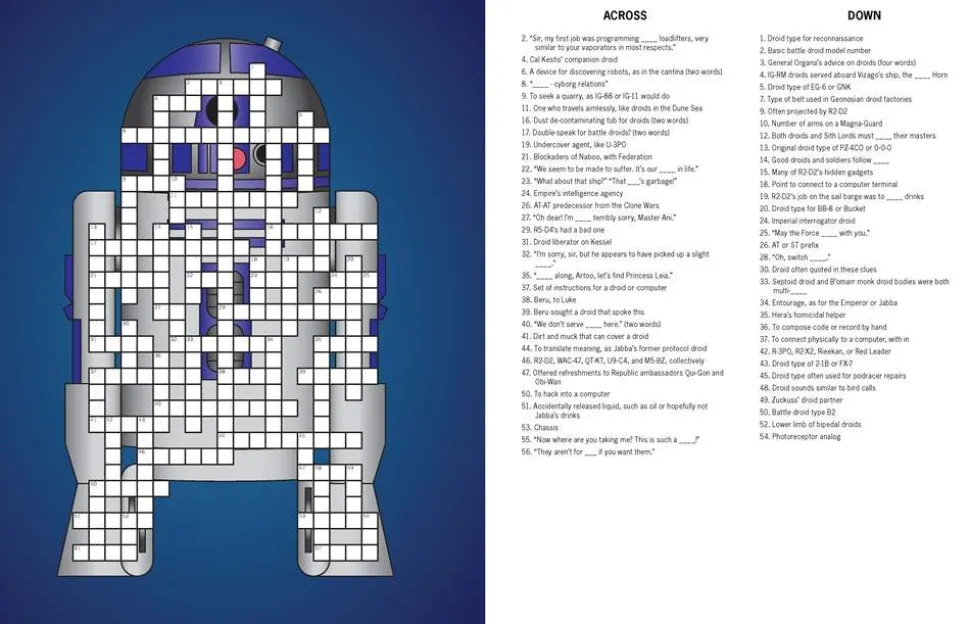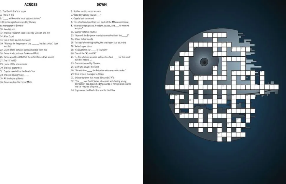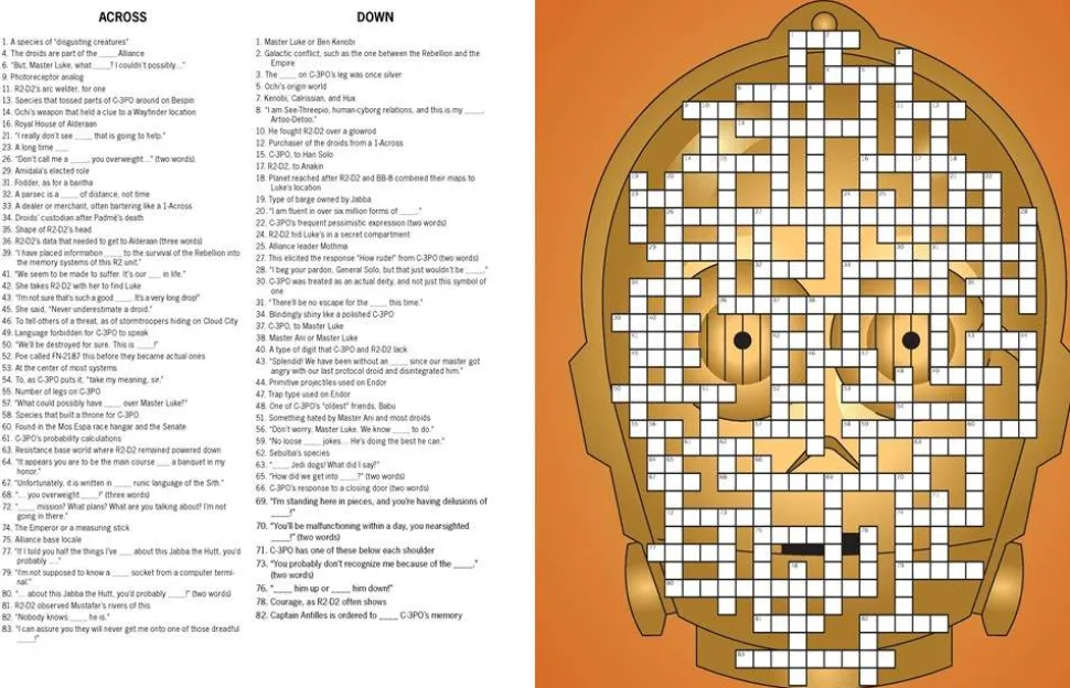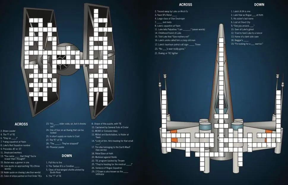 50+ PUZZLES OF DIFFERENT SKILL LEVELS: Themes include ships and pilots, Sith lords, scum and villainy, droids, Tatooine, the Galactic Empire, lightsaber duels, and much more! Puzzle difficulty levels range from Padawan puzzler to Jedi crossword Master.