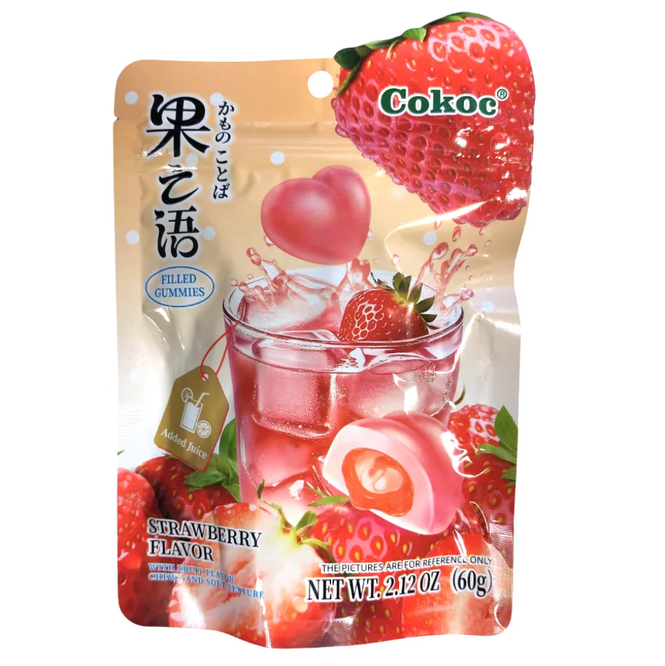 Ingredienser:Fiberkonsentrat (oligofruktose, galactoolisakkarider, isomaltooligosakkarid, polyglukose), glukosesirup, gelatin (storfé), potetstivelse, jordbærjuicekonsentrat, surhetsregulerende midler (E330, E331), fortykningmidler (E406, E440), sukker, konserveringsmidler (E296), aroma, palmeolje, overflatebehandlingsmidler (E903), fargestoff (E129*).