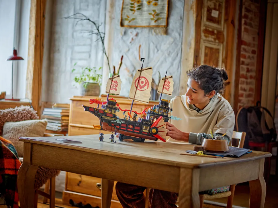 - Interaktiv skipsleke – NINJAGO® fans vrir på et tannhjul for å bevege seilene, tar av tak og gulv for å få tilgang til interiøret med en sushi-bar og slår sammen et bord i hovedlugaren for å avsløre en hemmelighet