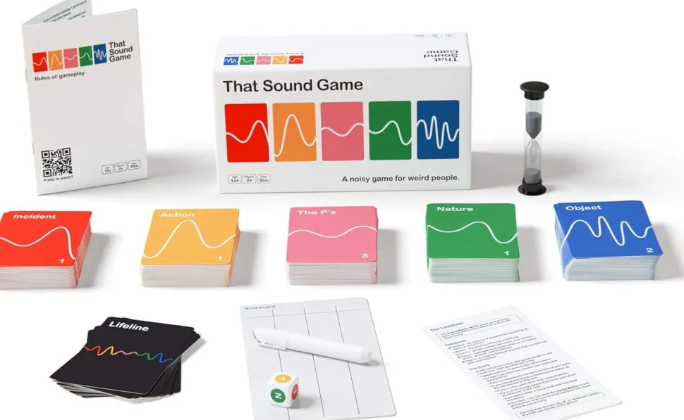 That Sound Game is a fast paced, interactive and very noisy party game.The goal is to get your team to guess as many answers on the category cards as they can ina minute. Use any combination of sounds and movements, but your hands must be behind your back.You also get Lifelines. Use them strategically to help you win.—description from the designer