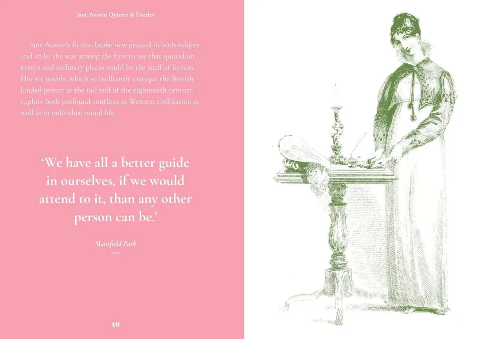 Use your ingenuity to find the country homes, city streets and servants hidden in the wordsearch puzzles. Find the quotations to solve the crossword puzzles – there is one for each of the six novels – and play the name game to see how many of the 156 quiz questions you can answer, from the colour of Eleanor Tilney’s beads to the name of Mr Darcy’s mother; from the town where the Miss Musgroves went to school to the month in which Emma first saw the sea.