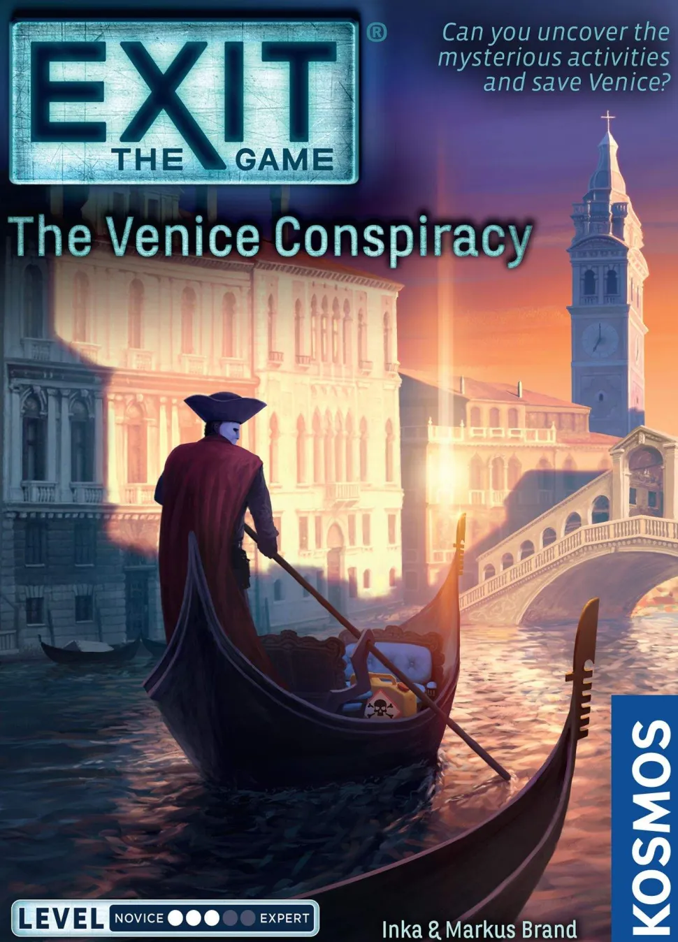 St. Mark’s Square, the Grand Canal, the Rialto Bridge — mysterious adventures await in the dream city of Venice, specifically a top-secret mission for your team. Can you uncover the mysterious activities and save Venice?EXIT: Das Spiel – Die Venedig-Verschwörung (The Venice Conspiracy) is a puzzle game modeled after escape rooms, and it includes components meant to be folded, written upon, or torn, so it’s marketed as a single-use game.