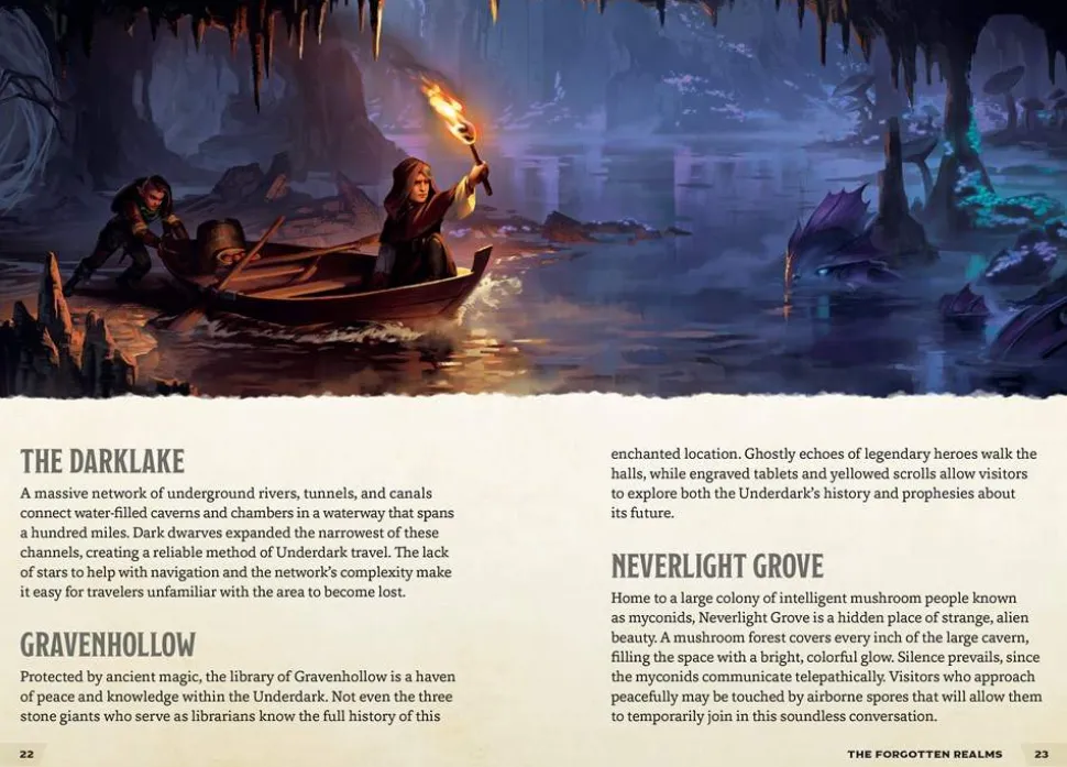 Explore the geography, inhabitants, and legends of D&D realms with Places & Portals. Featuring fascinating lore, advice on wilderness survival, and the basics needed for any journey, this guide will help you traverse the worlds of D&D—and create your own!