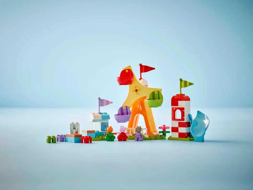 Gi barn morsomme og spennende lekeopplevelser med LEGO® DUPLO® Peppa Gris på tivoli (10453). Førskolebarn fra to år kan leke at de tilbringer en dag på tivoli sammen med velkjente lekefigurer fra favorittserien sin. De kan sende figurene av Peppa Gris, Kara Katt og Hasse Hund på roterende eventyr med pariserhjulet, og etterpå kan de bytte på å rutsje ned sklien.
