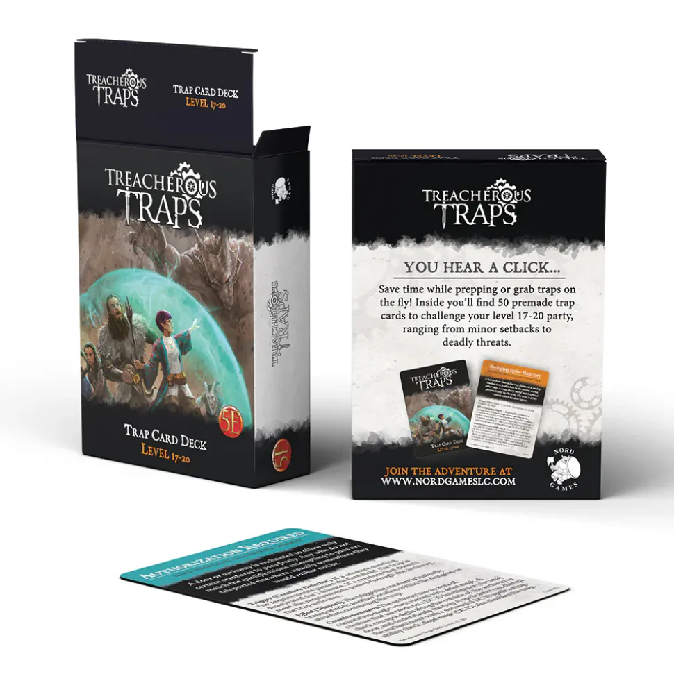 Save time while prepping or grab traps on the fly! Inside you’ll find 50 premade trap cards to challenge your level 17-20 party, ranging from minor setbacks to deadly threats.