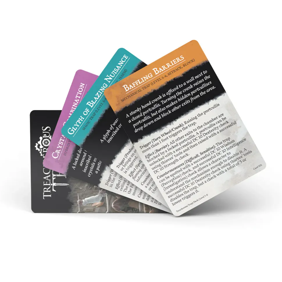 Save time while prepping or grab traps on the fly! Inside you’ll find 50 premade trap cards to challenge your level 5-8 party, ranging from minor setbacks to deadly threats.