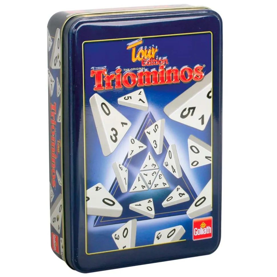 Triominos is a game similar to Dominoes, in that players are laying tiles that match up to other tiles in the play area, with the goal to get points and be rid of tiles. In Triominoes, the pieces are triangles with numbers that are matched on each side. Each triangle has 3 numbers at the points, so to place a piece next to it, it must match two numbers on the side.Pressman also released Quad-Ominos.Goliath released a 6 player version with 20 additional unique stones as Triominos Gold.