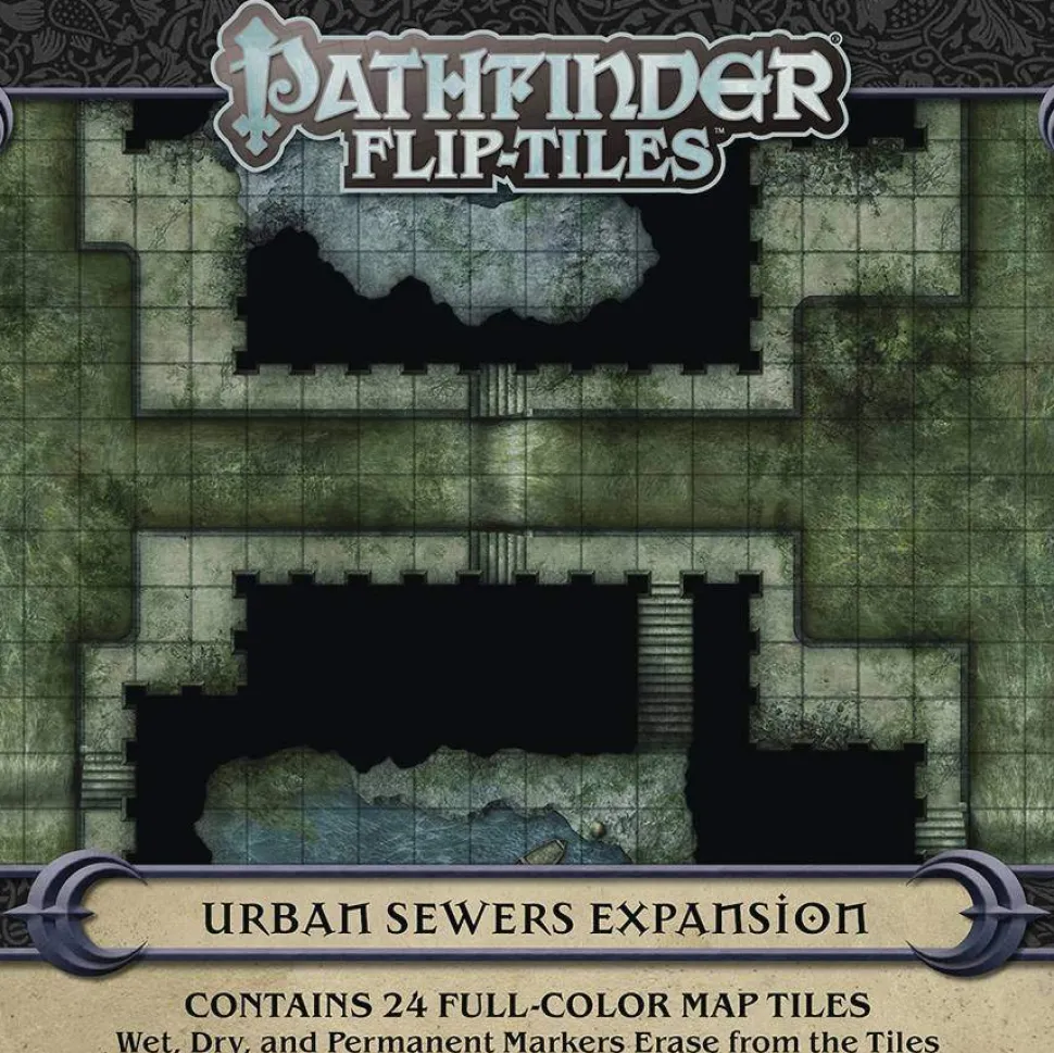 Sometimes the fastest way to traverse the city is to move under it! Flip-Tiles: Urban Sewers Expansion is the newest expansion to Flip-Tiles: Urban Starter Set. With 24 full-color 6 x 6-inch double-sided tiles, each stunningly crafted by cartographer Jason A. Engle, you can wade through the muck, balance along the side passages, and find the hidden lairs of wererats, cults, or worse. All perfect for the next time the heroes decide a sewer crawl is in order!