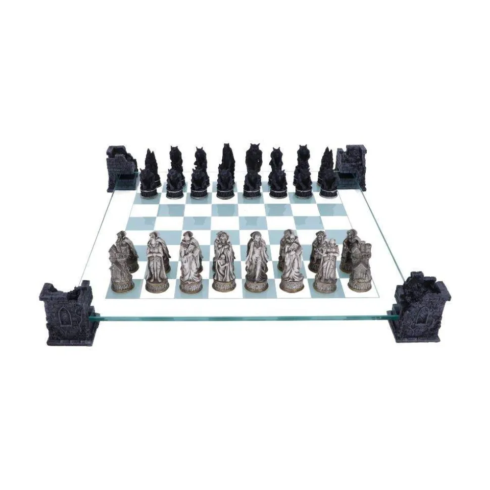 Flex your brain and challenge your friends with this dark Gothic chess set from alternative brand Nemesis Now’s giftware collection. Held above the table by 4 black towers, each standing in ruins, this glass chessboard has Viking-style geometric knots and interlinking loops around the edges. On it, two fearsome armies face each other – one a silvery legion of vampires, the other a dark horde of werewolves. With each piece cast in the finest resin before being carefully hand-painted, this chess set is the perfect way to recreate this ancient enmity and challenge your horror-loving friends to a contest of strategy.