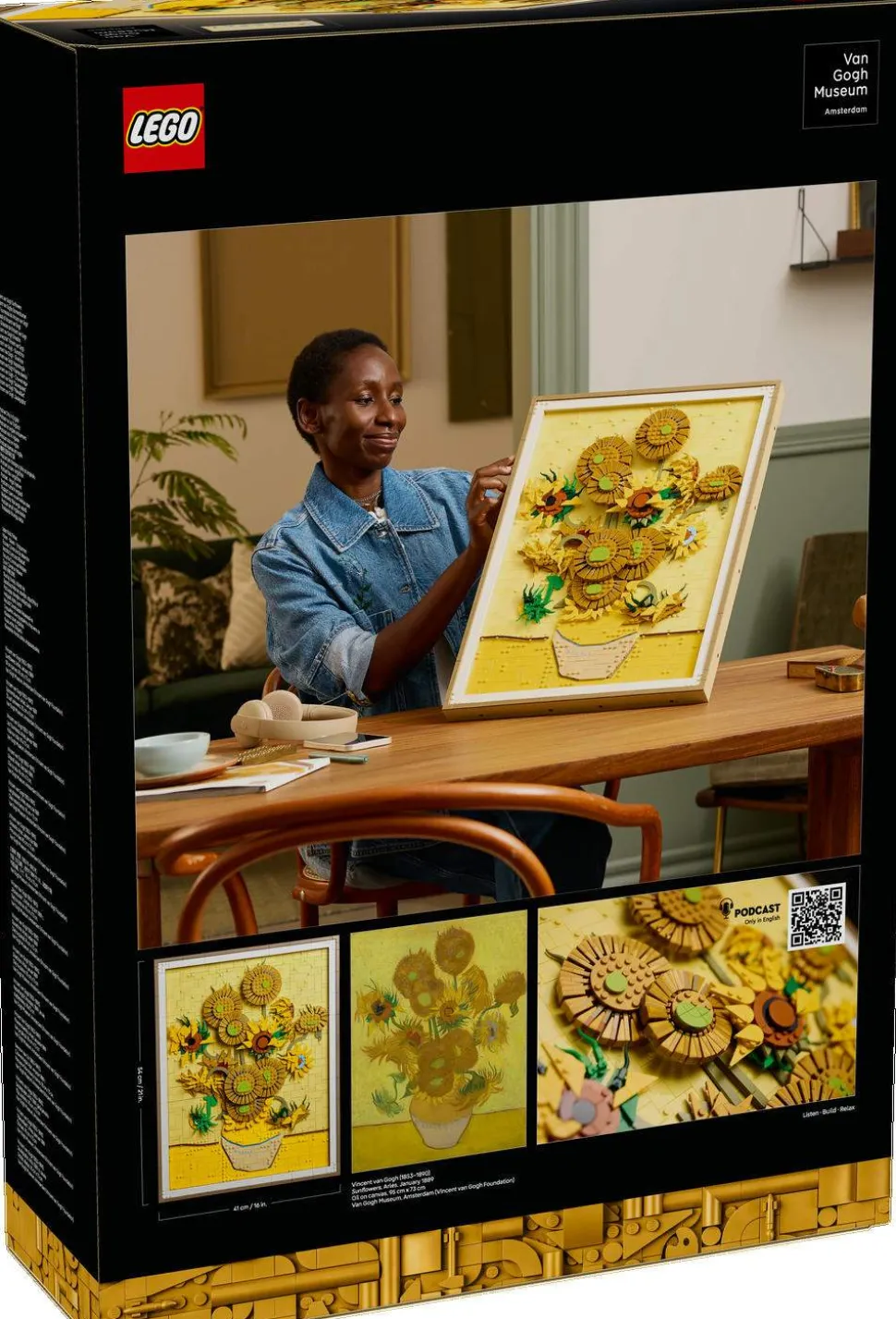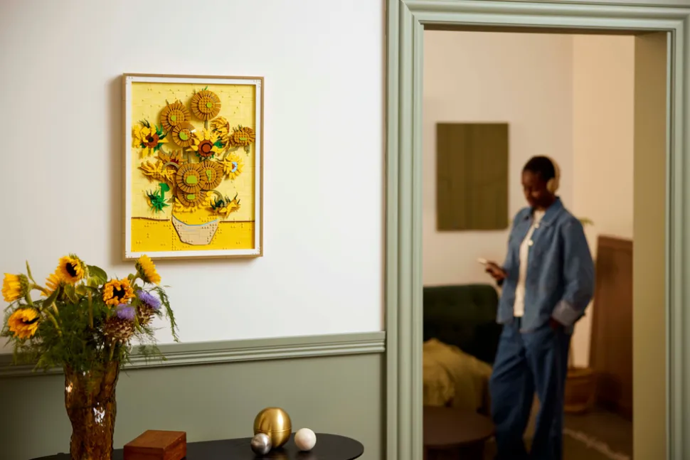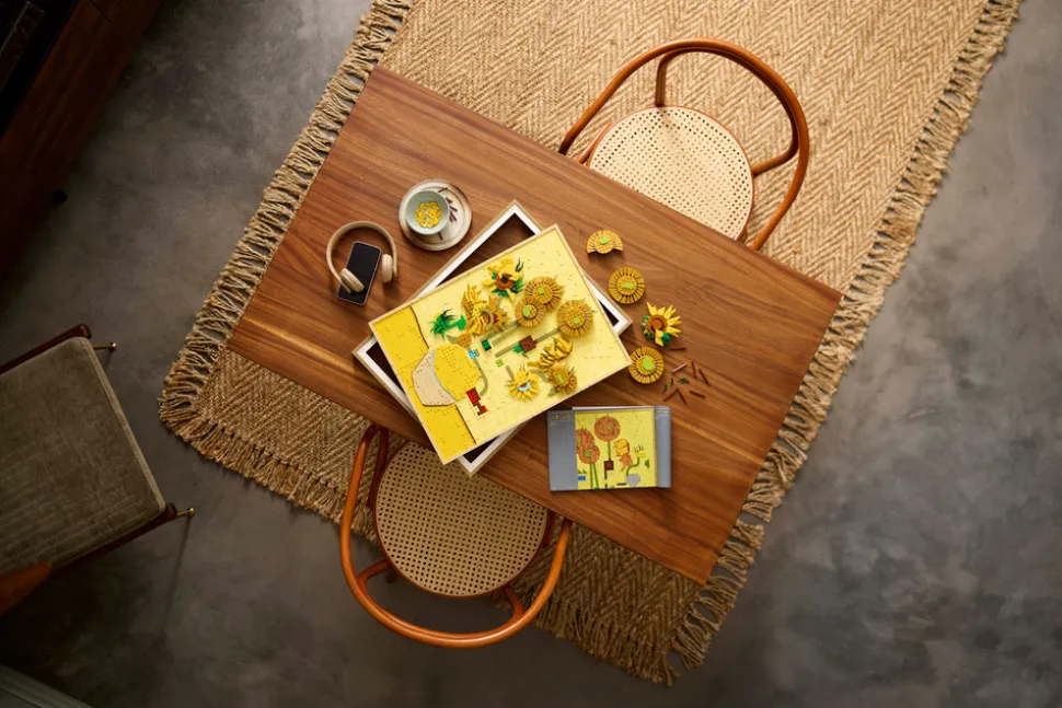 La deg imponere av Van Goghs geni og hans sprelske bruk av farger i dette settet som gjenspeiler maleriets tre nyanser av gult og Van Goghs berømte bruk av lys og skygge. Dette LEGO veggkunstsettet består av 2615 deler og består av 16 solsikker med justerbare kronblader, en avtakbar ramme, en flis med Van Goghs signatur på og et opphengselement til å henge det på veggen med.