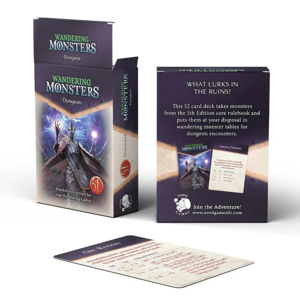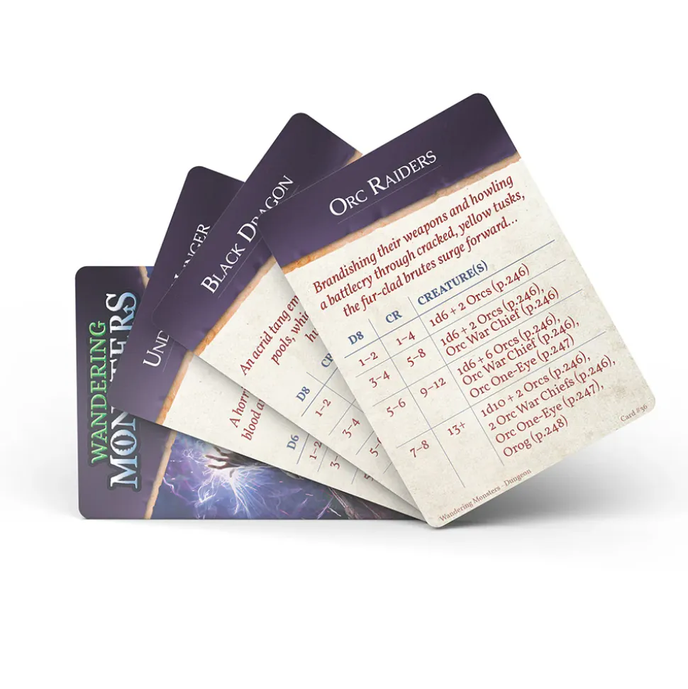 This deck contains 52 cards, each with 3-5 possible encounters for dungeon environments for 5th Edition. The encounter can be chosen based on the appropriate challenge rating, or roll a die to leave the experience to chance. Save yourself hours of setup time and challenge your players with monsters you never thought to use!
