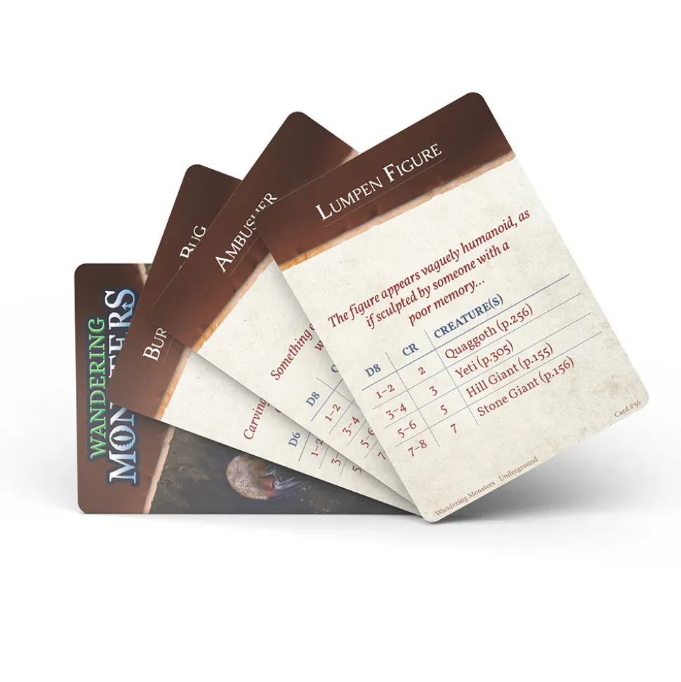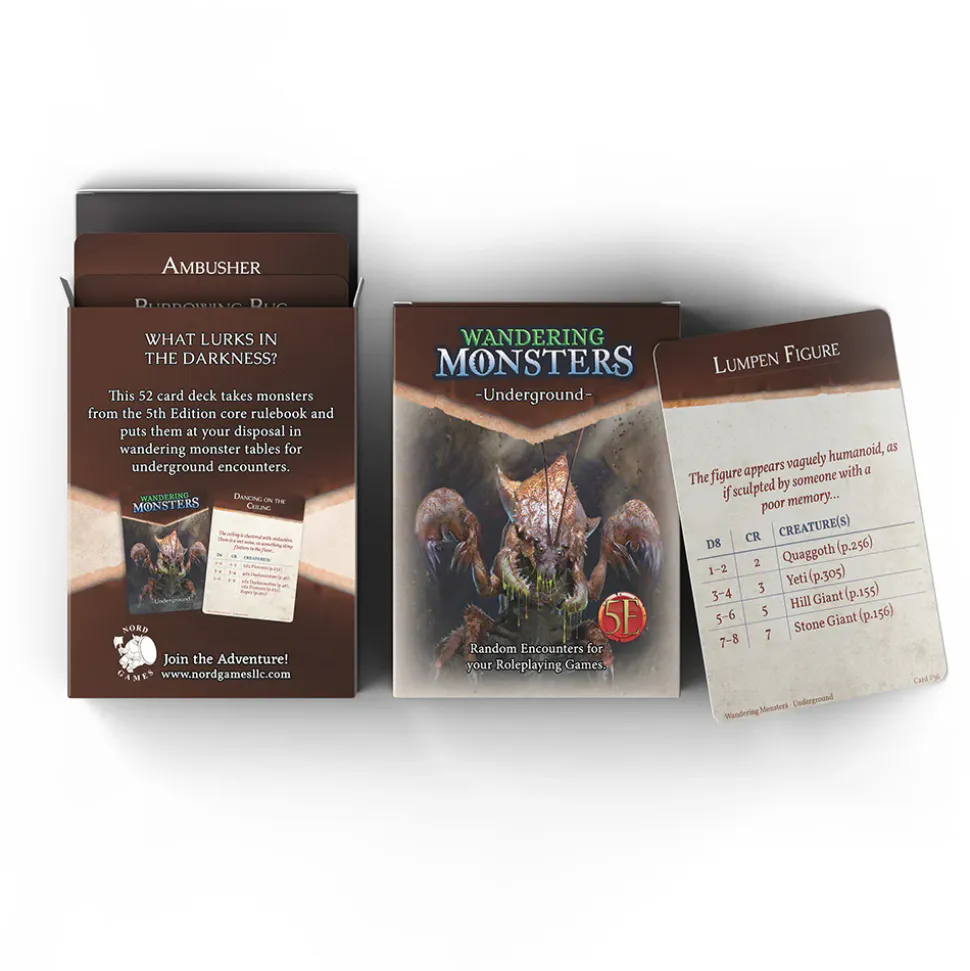 The Wandering Monster Deck: Underground (5E) contains 52 cards, each with 3-5 possible encounters for underground environments for 5th Edition. Choose each unique encounter based on the appropriate challenge rating, or roll a die. Save yourself hours of setup time and challenge your players with monsters you never thought to use! Order your monster expansion pack today and collect them all!