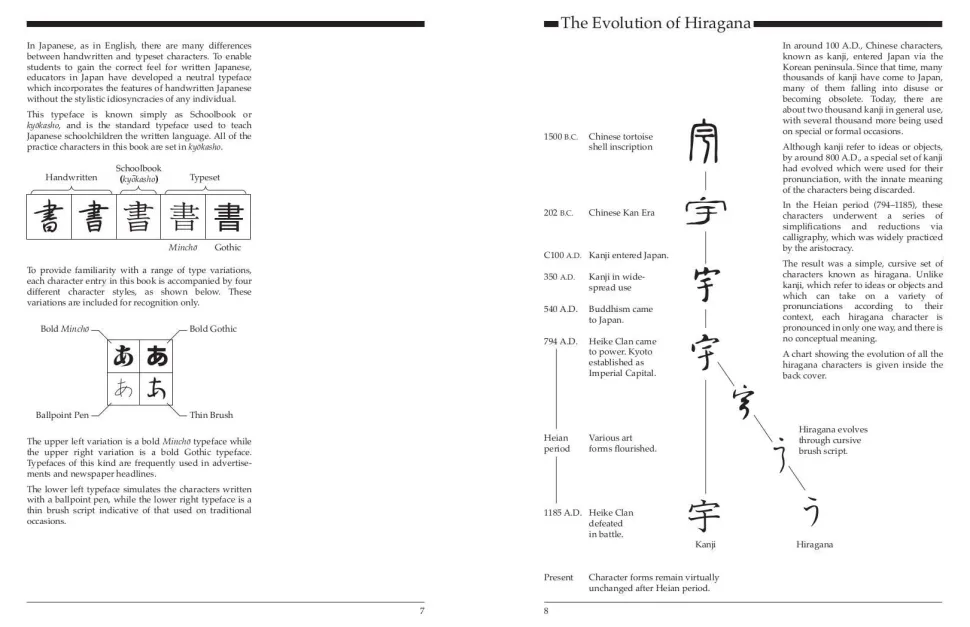 Each character is introduced with brushed, handwritten, and typed samples which enhance character recognition. Extensive writing space allows for maximum practice to facilitate memorization and ensure proper character formation. Entertaining illustrations and amusing examples of onomatopoeic usage of hiragana in Japanese writings further reinforce memorization in a fun way.