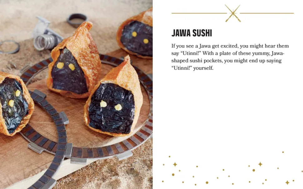 BITE-SIZE AND DELICIOUS: Yato yato. Find here a culinary adventure for all: from padwans to Jedi masters, and everyone in between. Discuss intergalactic politics over a Chandrilan Cheese Board, reminisce about your (imaginary) trip to Kashyyyk over a refreshing Shi-Shok Fruit Bowl, invite friends to crunch with you on some healthy Moss Chips from Dantooine, and so many more intergalactic tasty treasures of a long, long time ago and very far away.