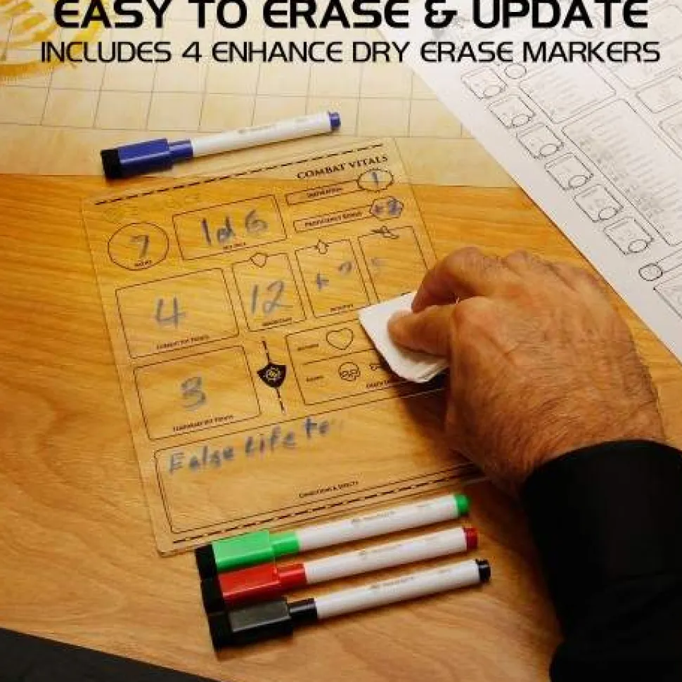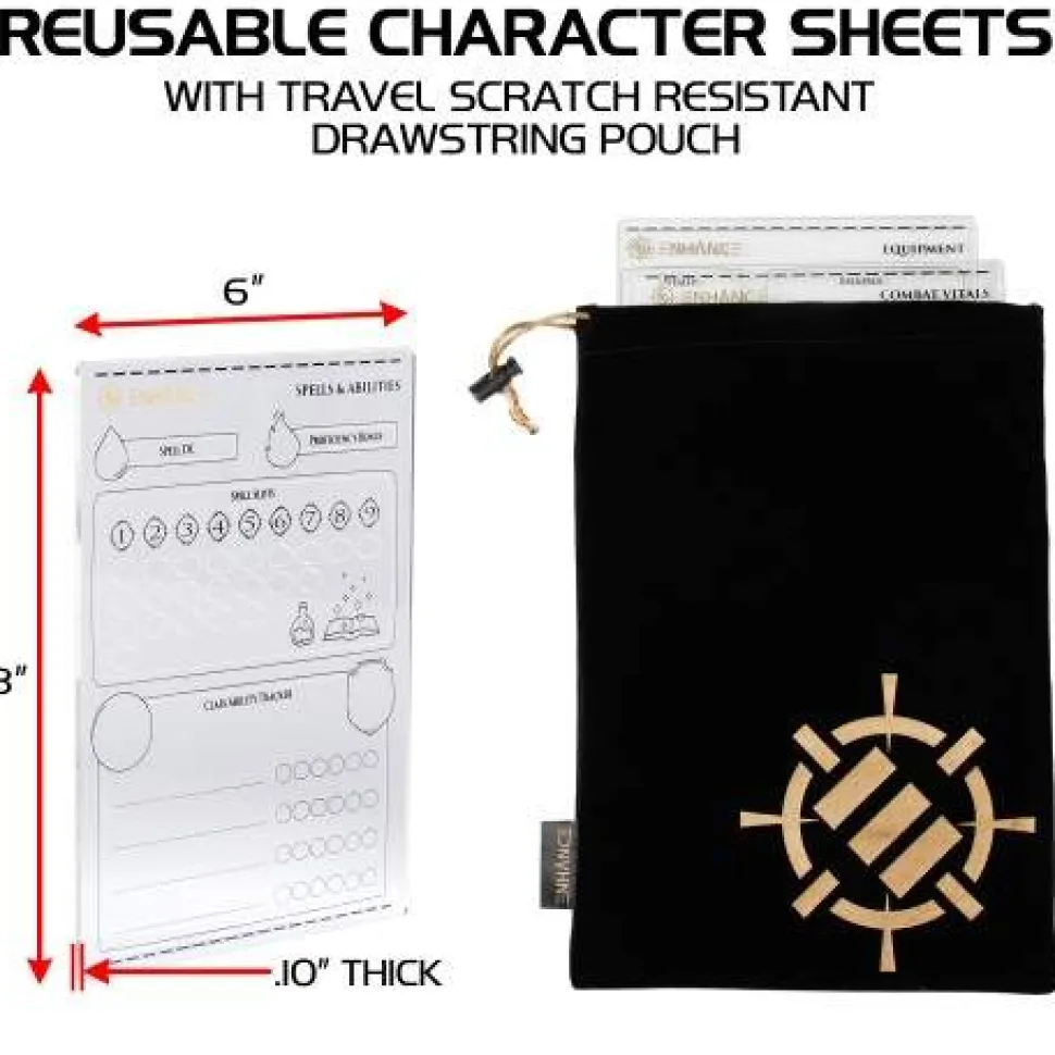 Designed for use with Dungeons and Dragons 5e so you can track resources, abilities, and more—all while saving your Character Sheet from eraser smudging! Three sheets come in the set: Combat Vitals, Equipment, and Spells & Abilities. The sheets are made of acrylic and are to be used with dry erase markers (a set is included) and come in a handy and soft drawstring pouch with dividers that separate and protect the individual sheets during travel and storage. They’ll work alongside your Character Sheet paper copy to track and update the most dynamic stats on a reusable acrylic surface that is bound to impress your friends even during the most competitive campaign.