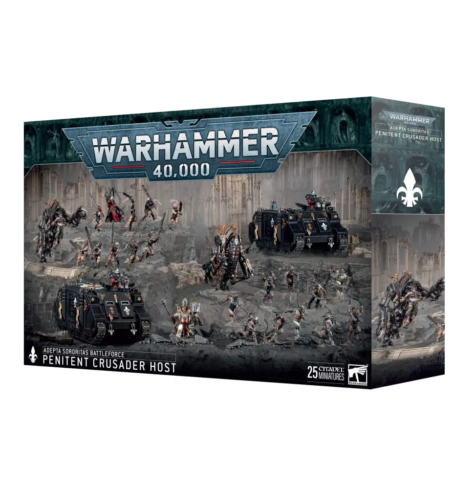 Help these wayward sisters return to the Emperor’s graces with this boxed set. The Penitent Crusade Host is led into battle by a hardline Ministorum Priest, who inspires Repentia and Arco-Flagellants under their watch as they disembark from a pair of Rhino troop carriers. They are accompanied by a pair of Penitent Engines piloted by those who still have a chance to atone for their crimes.
