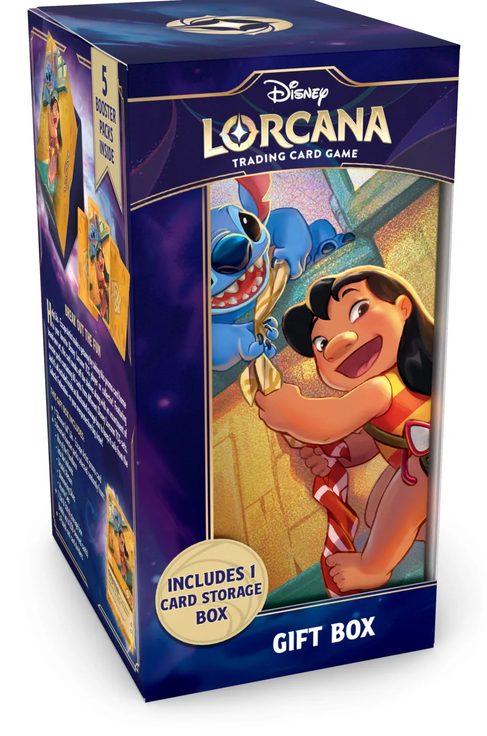 This Disney Lorcana Gift Box includes a unique foil card featuring brand-new Lilo art and comes with an assortment of Booster Packs containing 60 cards from different Disney Lorcana TCG sets. Everything is inside an illustrated storage box to keep up to 250 sleeved cards safe.