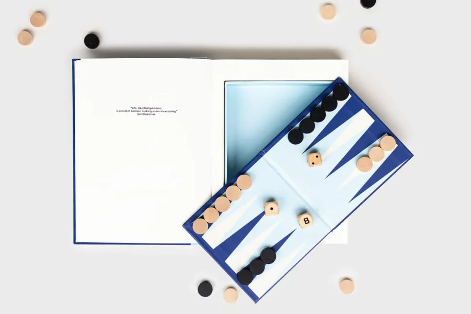 Open up this hardback, cloth-covered book and you’ll find a Backgammon board, dice and pieces neatly stashed within the pages. When the game is over, display the set on your bookshelf or coffee table. Backgammon brings people together. Whether you’re a seasoned player or new to the game, this set offers endless opportunities for intellectual stimulation and friendly competition. Pages include rules of the game in four languages.