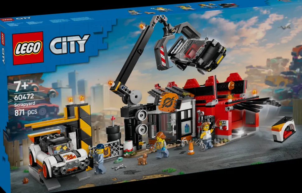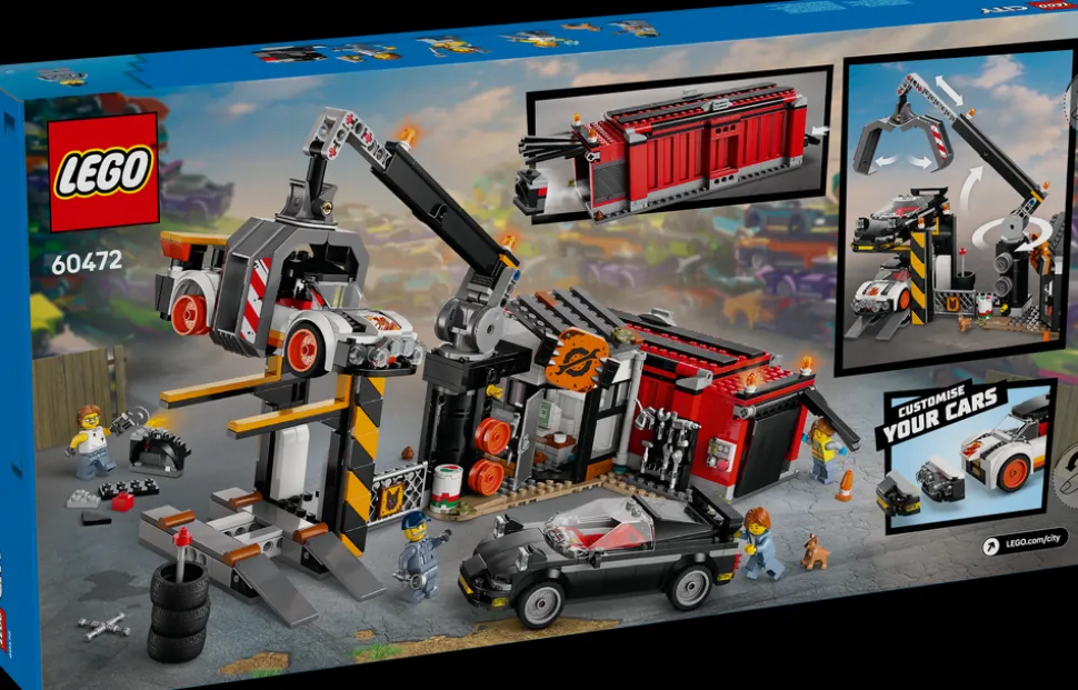 - Hva inneholder esken? Dette LEGO® bilopphuggerisettet inkluderer alt barn trenger for å bygge et bilopphuggeri med klokran, knusemaskin, kontorbygning, to biler og fire minifigurer av arbeidere