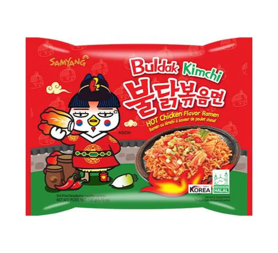 Populære Buldak Hot Chicken Ramen kjent fra fire noodle challenge på YouTube og TikTok. Dette er en variant med sterk kimchi smak.